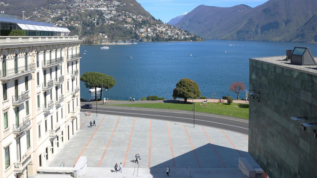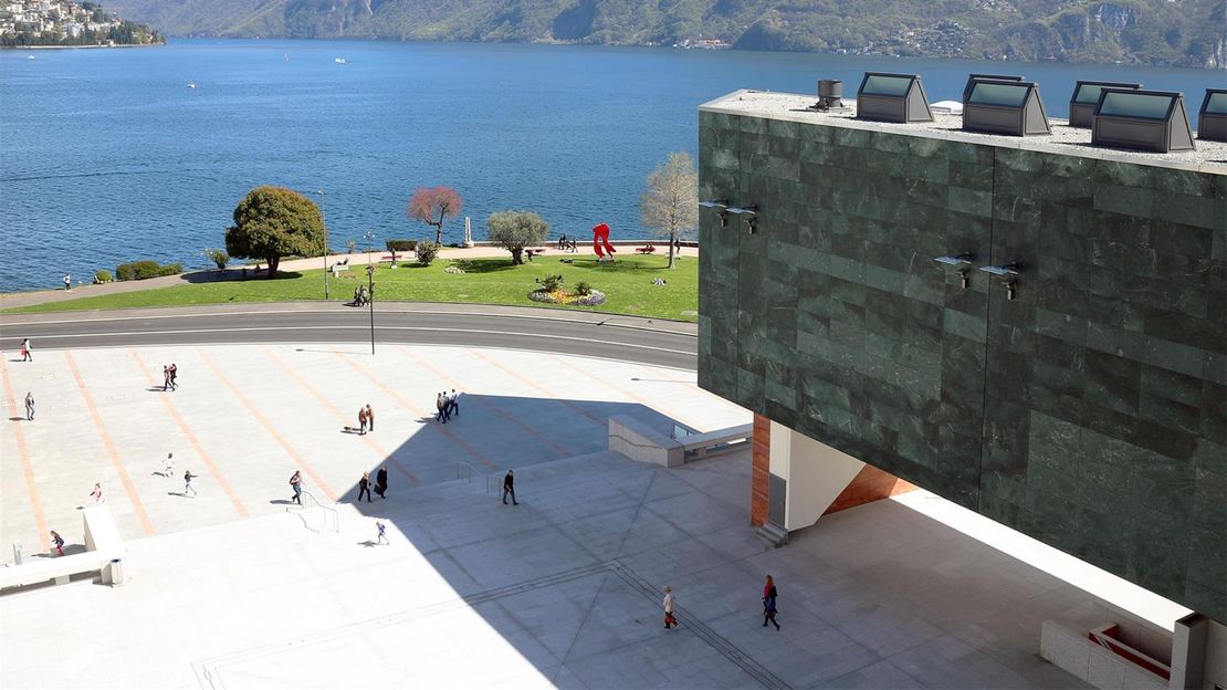 Se la grande hall è il punto di accoglienza e il momento di adesione al LAC, è però vero che la relazione del centro culturale con il suo pubblico inizia qui, in piazza Bernardino Luini, un luogo che prima non esisteva, disegnato e forgiato insieme al LAC e che ora, con un’estensione di 2.500 metri quadrati, costituisce la piazza più grande della città. Già il primo impatto con l’armonia inclusiva di questa piazza è un preludio all’estetica e alla visione del centro culturale: una condivisione di stili, momenti storici e livelli diversi. La geometria trasparente della grande hall che incrocia il frontale neoclassico dell’ex Grand Hotel Palace e la compattezza volumetrica dell’ala del museo compongono un polittico di grande effetto, che la vastità della piazza permette di ammirare nel suo insieme.