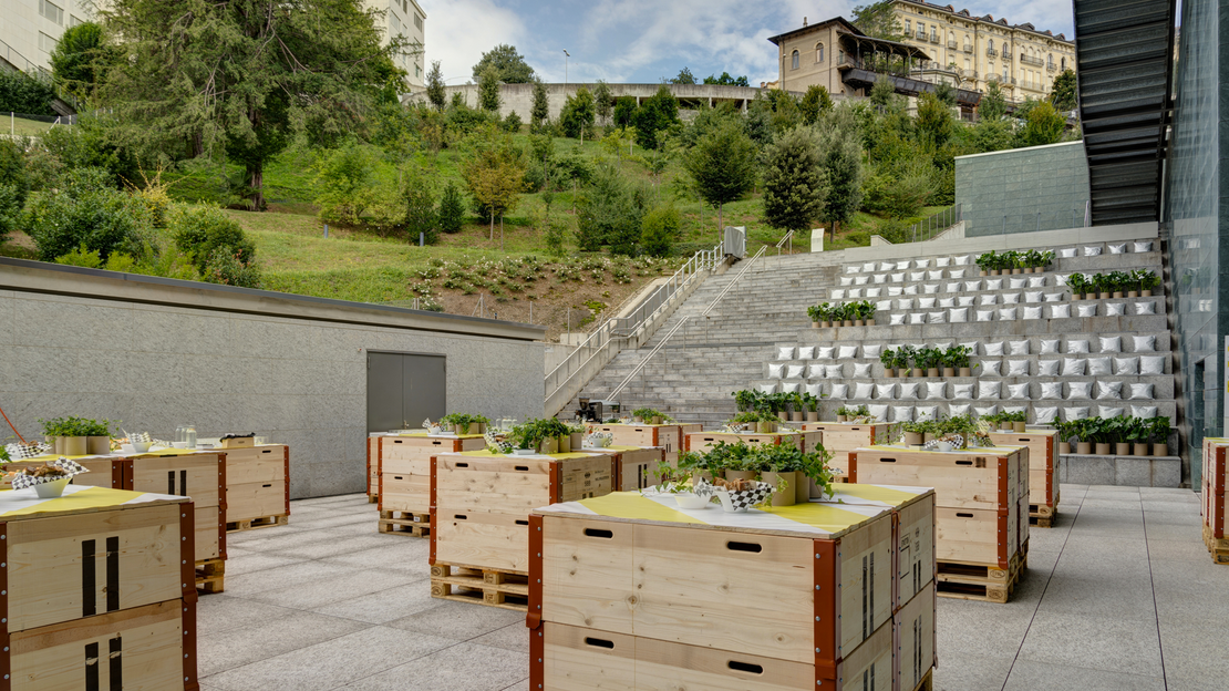 È lo spazio esterno dedicato agli eventi privati, con una doppia funzionalità. Il suo anfiteatro può accogliere fino a 200 persone sulle gradinate per presentazioni o spettacoli, mentre l’ampio terrazzo è anche un contesto ideale per feste, aperitivi e standing dinner circondati dal parco e con vista lago, grazie alle ampie vetrate della hall.
